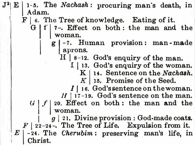The above structure is from the Companion Bible, a must have if you want to do serious Bible study. The word Nachash (2 (הַ)נְּחשֶׁת ׳נ, a bronze [shining] image of serpent) in E is the Hebrew word used for « Serpent », in this case a « Shining one ». When you read through the structure you see the brilliant balance. Against E — the Cherubim — has to be a balanced E and a serpent animal doesn’t balance with the spiritual Cherubim, another Cherub would, a shining one, as Paul tells us in 2 Cor. 11:14 « And no marvel; for Satan himself is transformed into an angel of light (thus the Nachash that seduced Eve.) ». Satan impressed Eve more than did God, a bright shining being, God showed Himself as a human, like how he showed Himself to Abraham. Gen 18:2.